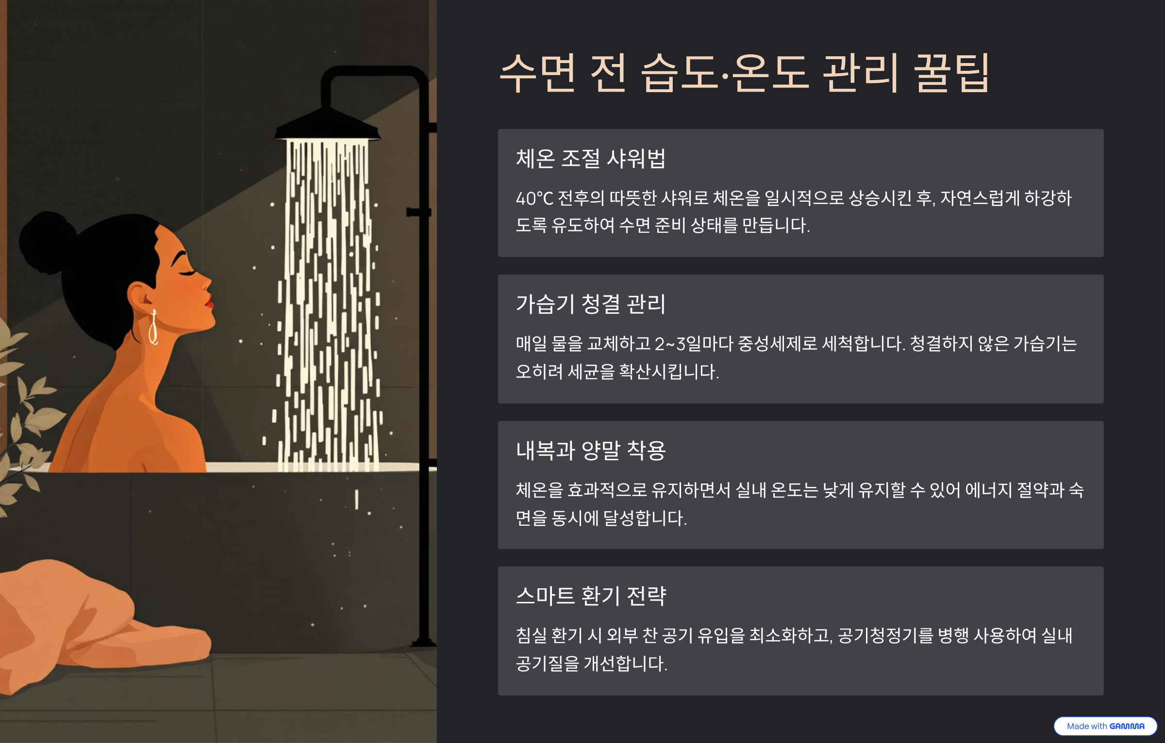 | 조도 (수면 전) | 낮은 조도 | 멜라토닌 분비 촉진 및 청색광 차단 |