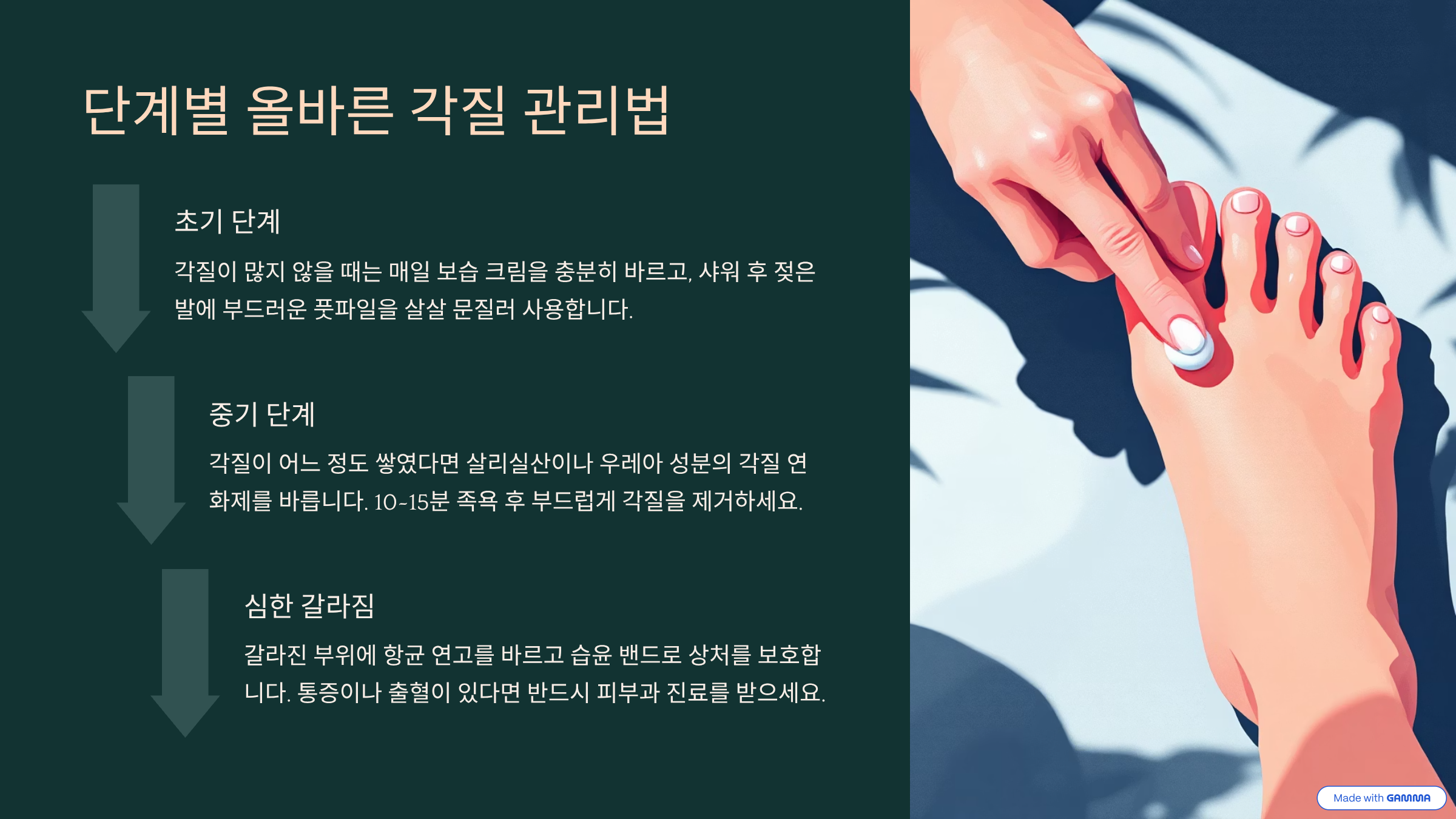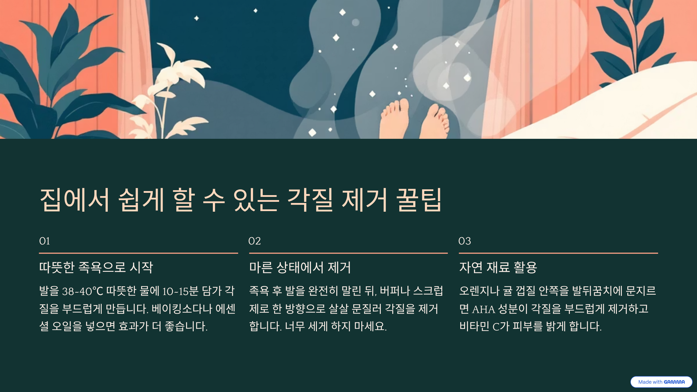 발을 깨끗이 씻은 후 미온수에 10분 정도 담가 각질을 부드럽게 불려줍니다. 그 후 발 전용 스크럽제나 버퍼(Pumice stone)를 사용하여 한 방향으로 가볍게 밀어냅니다. 이때 마른 상태에서 무리하게 갈아내는 것은 피부 보호막을 파괴하므로 주의해야 합니다.