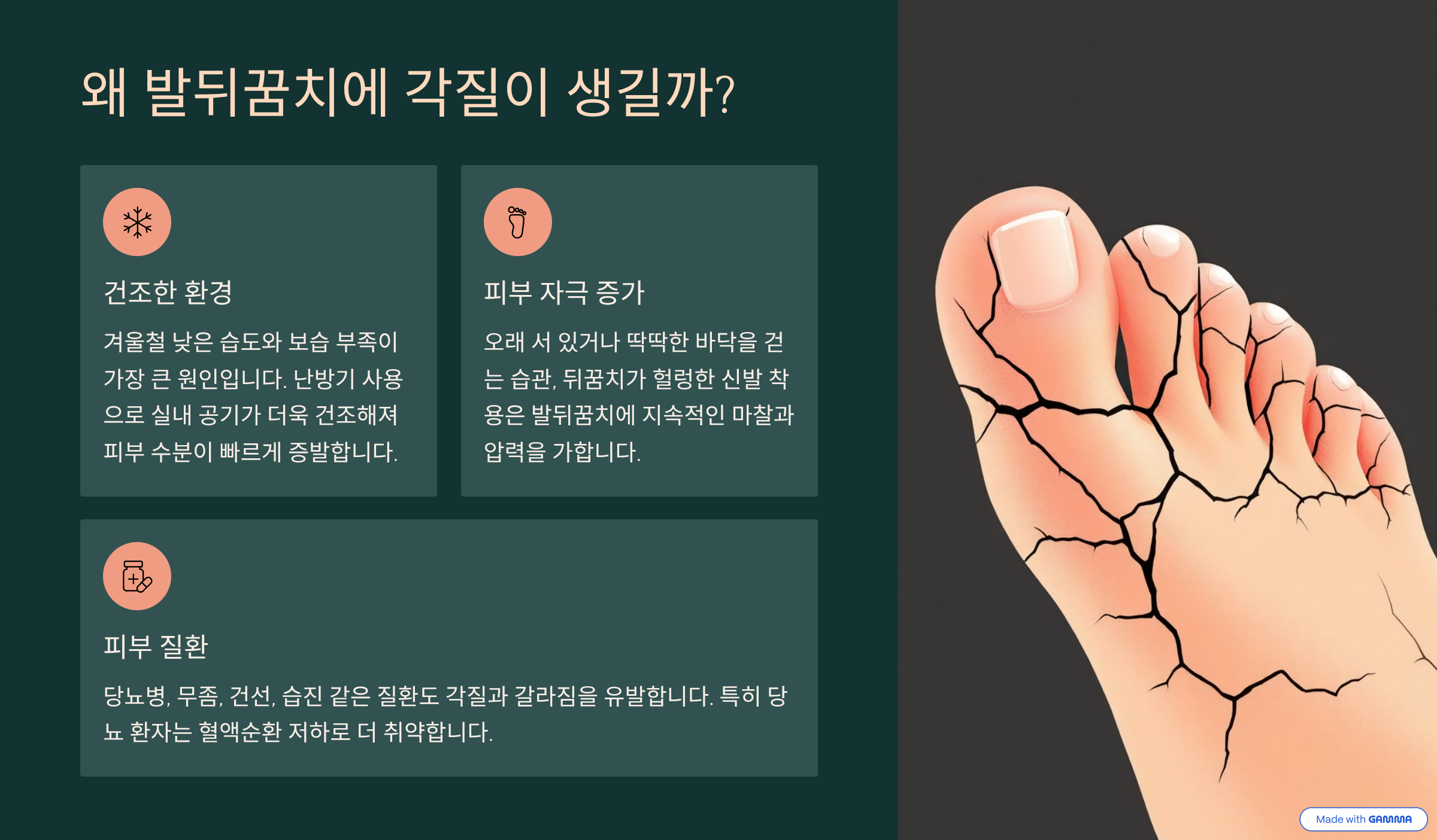 우리 몸의 피부 중 발바닥, 특히 뒤꿈치는 피지선이 없어 스스로 유분을 공급하지 못하는 구조입니다. 여기에 몇 가지 요인이 더해지면 각질이 층층이 쌓이는 '각화증'이 심화됩니다.
