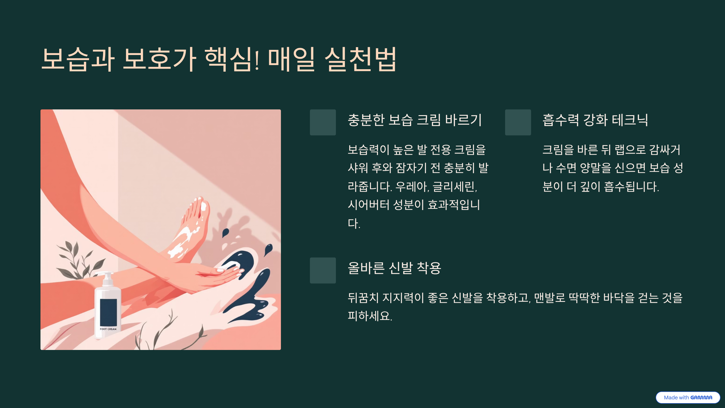 - 맨발 노출 지양: 실내에서도 슬리퍼나 양말을 착용하여 발의 수분이 공기 중으로 날아가는 것을 막아주어야 합니다.