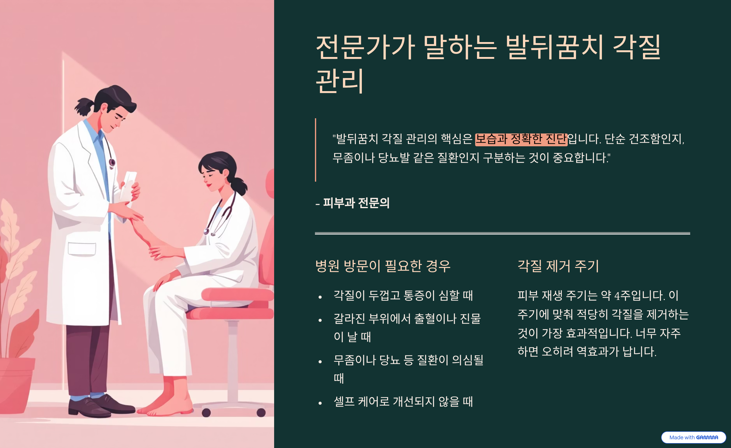 아무리 관리해도 차도가 없다면 단순 각질이 아닌 '각화형 무좀'을 의심해야 합니다. 많은 분이 무좀은 가렵고 진물이 나는 것으로만 생각하지만, 각화형 무좀은 증상이 전혀 다른 것이 특징입니다.