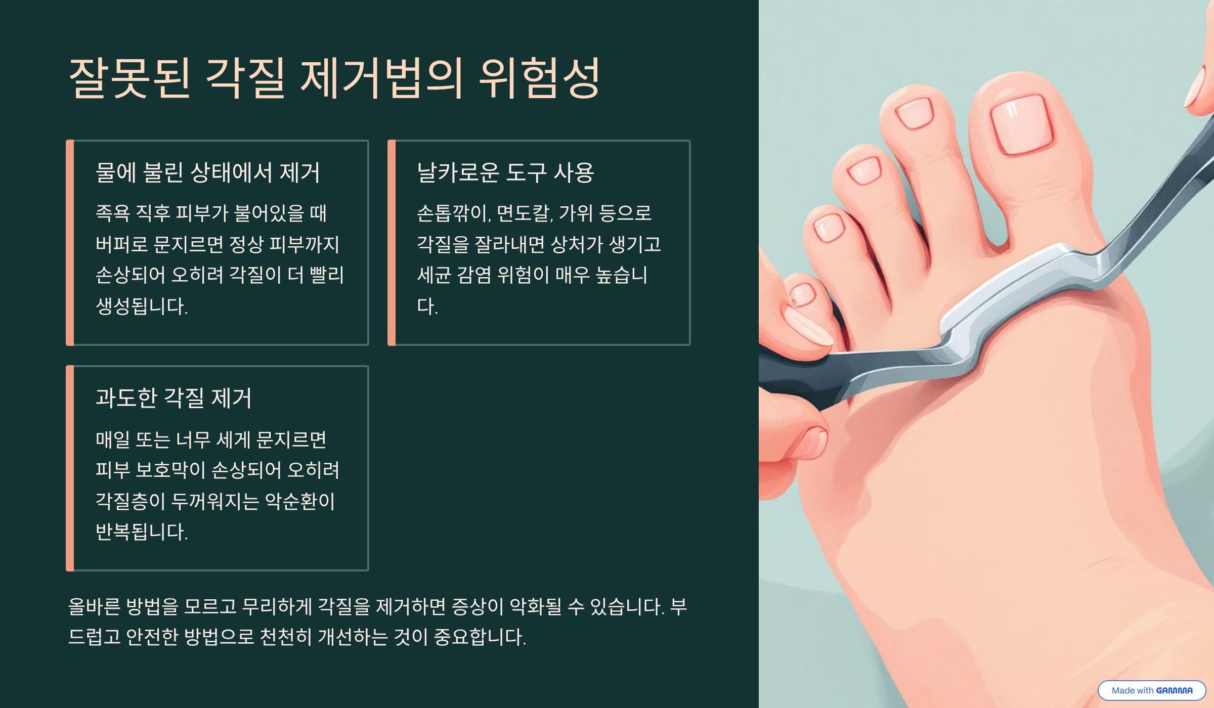 딱딱한 각질을 물리적으로 베어내는 행동은 절대 금물입니다. 죽은 각질뿐만 아니라 살아있는 정상 세포까지 손상시켜 세균 감염(봉와직염 등)을 일으킬 수 있으며, 피부는 자극을 받을수록 스스로를 보호하기 위해 더 두껍고 거친 각질을 만들어내는 '악순환'에 빠지게 됩니다.
