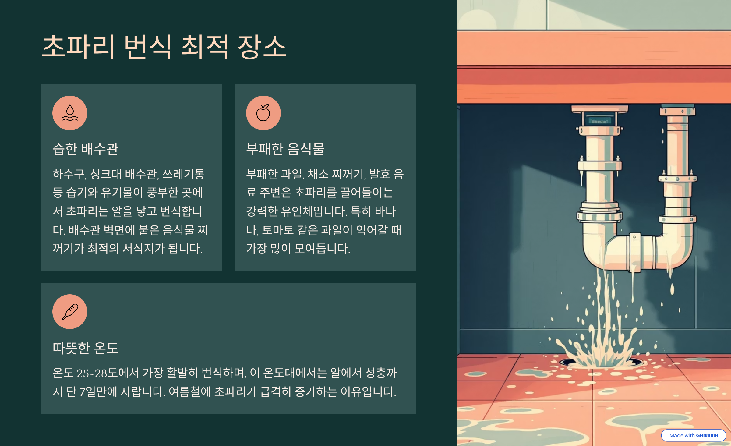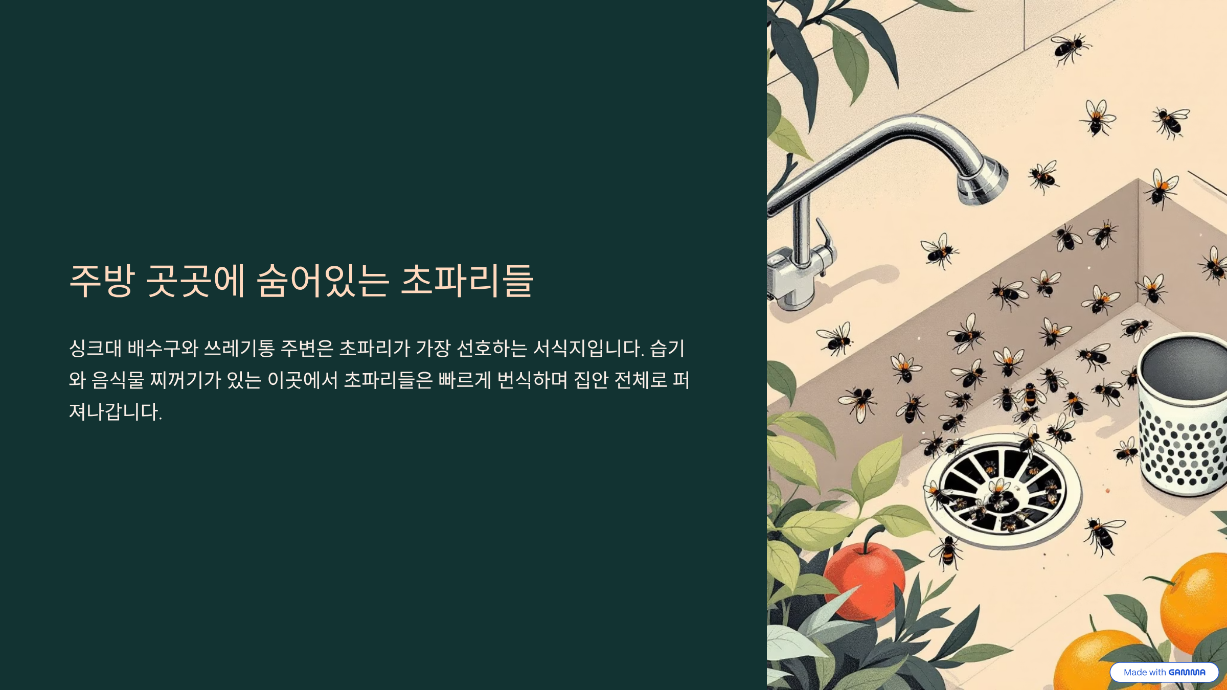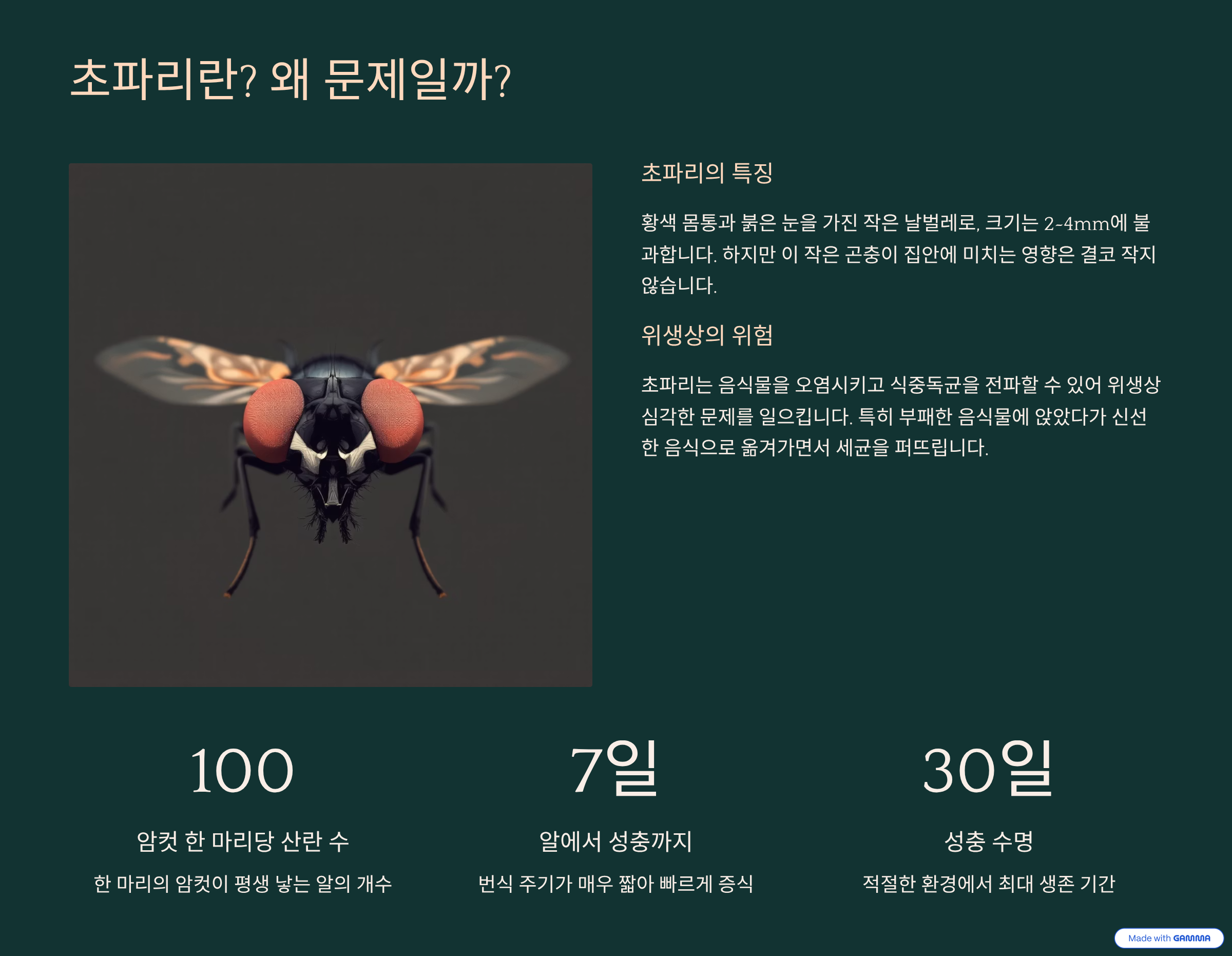초파리의 크기는 약 2~5mm에 불과하지만, 한 번에 낳는 알의 수는 무려 400~500개에 달합니다. 알에서 깨어난 애벌레는 약 10일이면 성충이 되어 다시 알을 낳을 수 있는 상태가 됩니다. 즉, 초기 대응에 실패하면 열흘 뒤에는 감당할 수 없을 만큼 개체 수가 늘어나게 됩니다. 또한, 초파리는 단순히 성가신 존재를 넘어 음식물에 세균을 옮기는 매개체 역할을 할 수 있어 위생 관리가 필수적입니다.