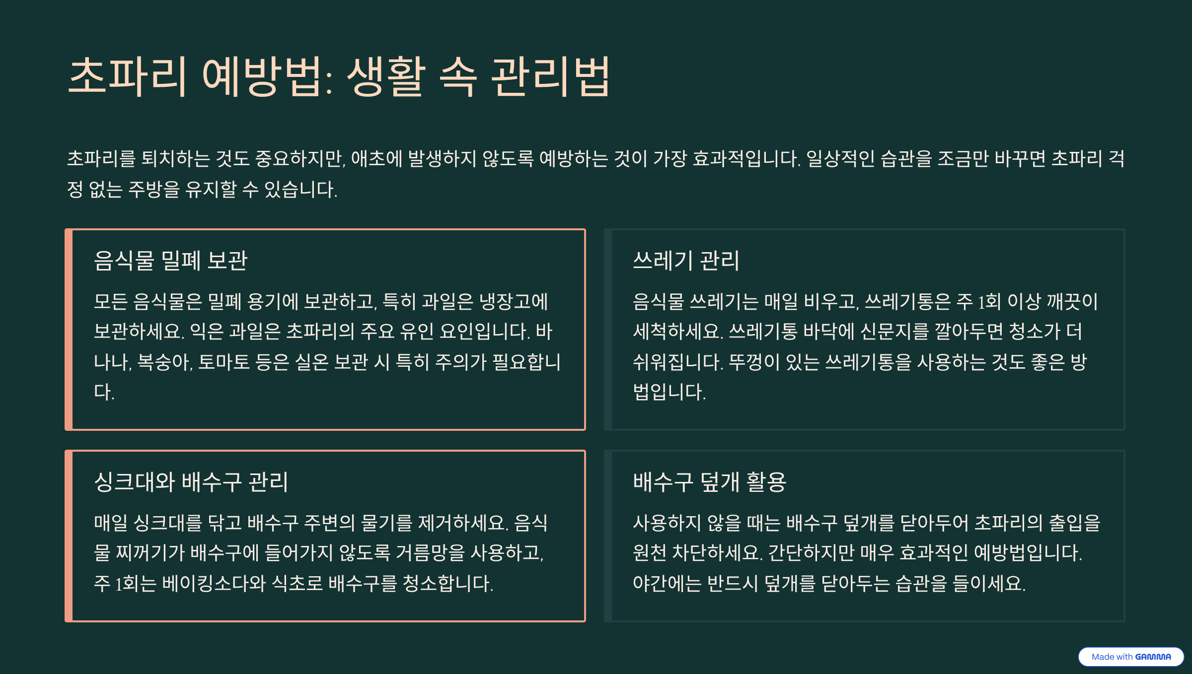 초파리가 가장 좋아하는 먹잇감을 원천 차단해야 합니다. 여름철 주방 위생의 핵심은 '즉시 처리'입니다.