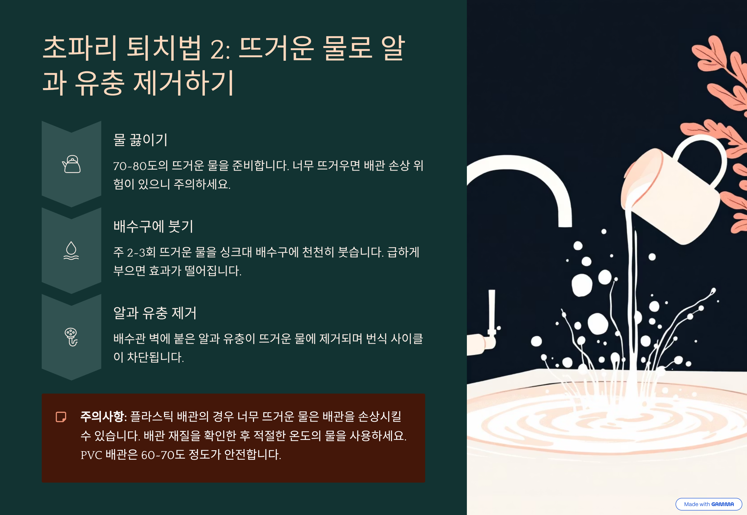 초파리는 싱크대 배수구와 화장실 하수구 내벽의 물때와 오물에 알을 낳습니다. 이를 방지하기 위해 1~2주에 한 번씩 하수구에 팔팔 끓는 뜨거운 물을 부어주는 것이 좋습니다. 뜨거운 물은 내벽에 붙은 유충과 알을 사멸시키는 효과가 탁월합니다. 여기에 베이킹소다와 식초를 함께 사용하면 세척 효과가 배가됩니다.