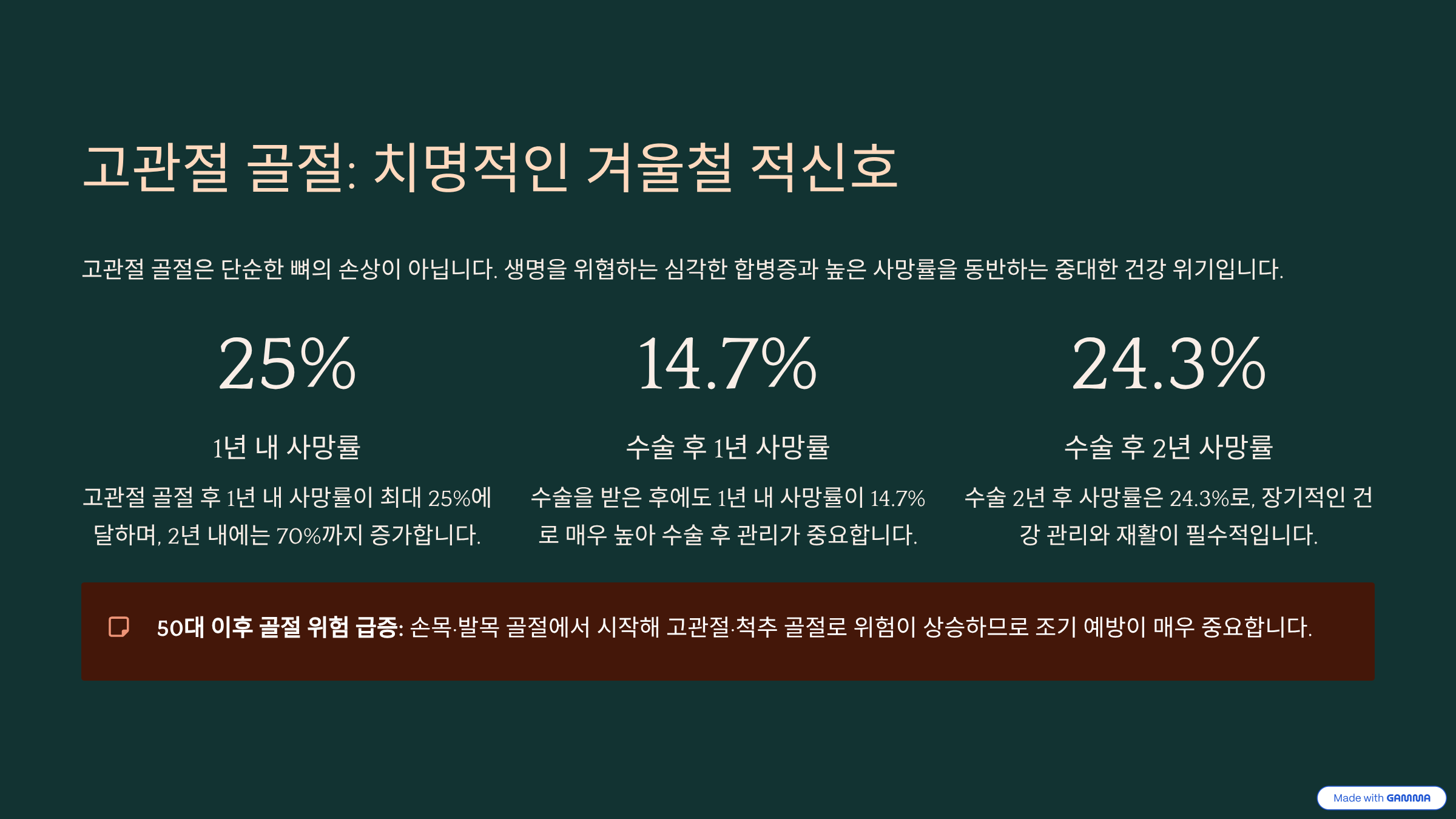 연세사랑병원 서동석 원장은 "고령자에게 고관절 골절은 시간과의 싸움이다. 빠른 수술과 조기 재활만이 합병증을 막고 다시 걸을 수 있는 유일한 길"이라고 강조했습니다. 겨울철, 부모님의 신발 밑창이 닳지는 않았는지, 집안 바닥이 미끄럽지는 않은지 세심하게 살피는 관심이 필요합니다.
