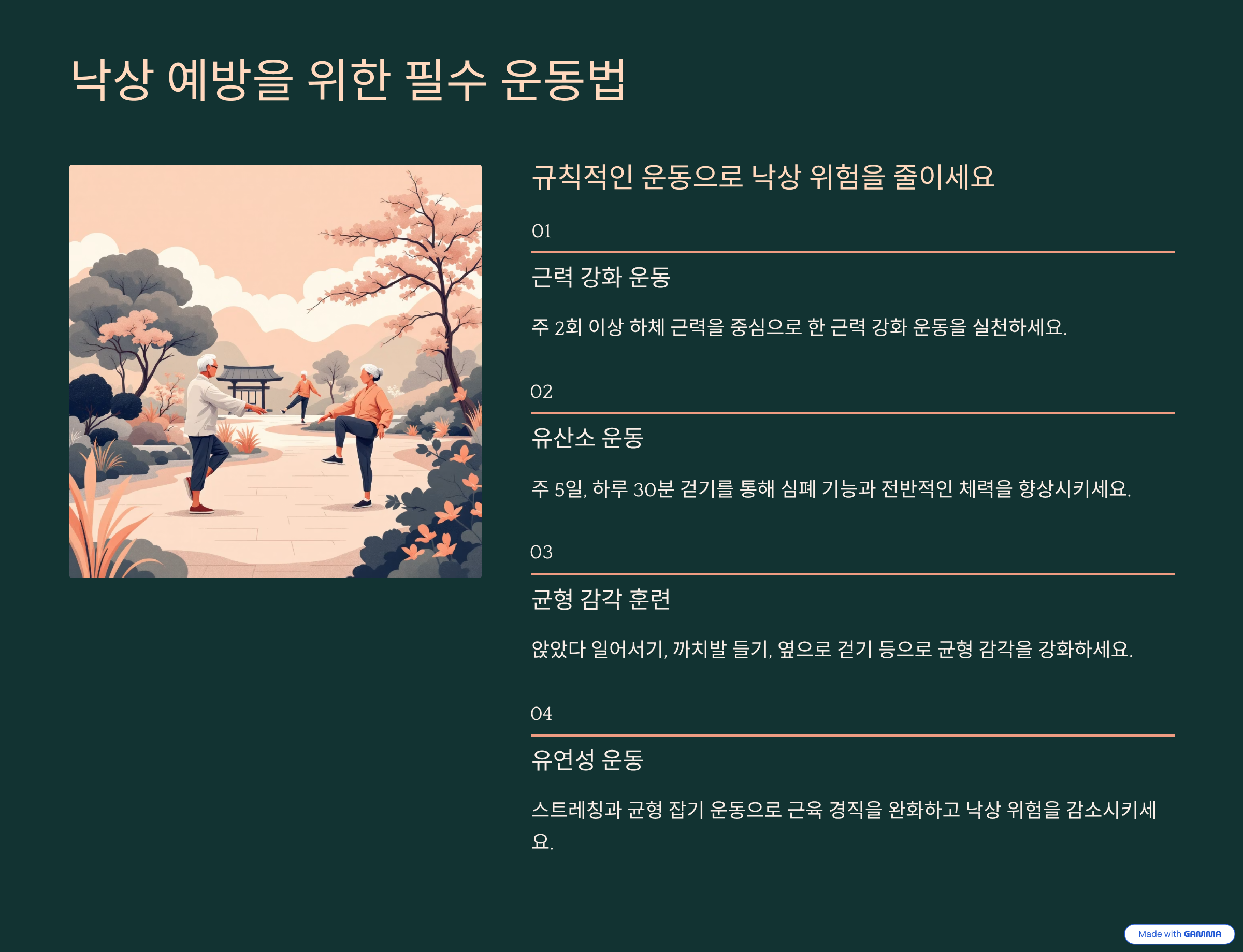 예방은 치료보다 백배 낫습니다. 일상 속에서 낙상 위험을 줄이기 위한 구체적인 실천 방안입니다.
