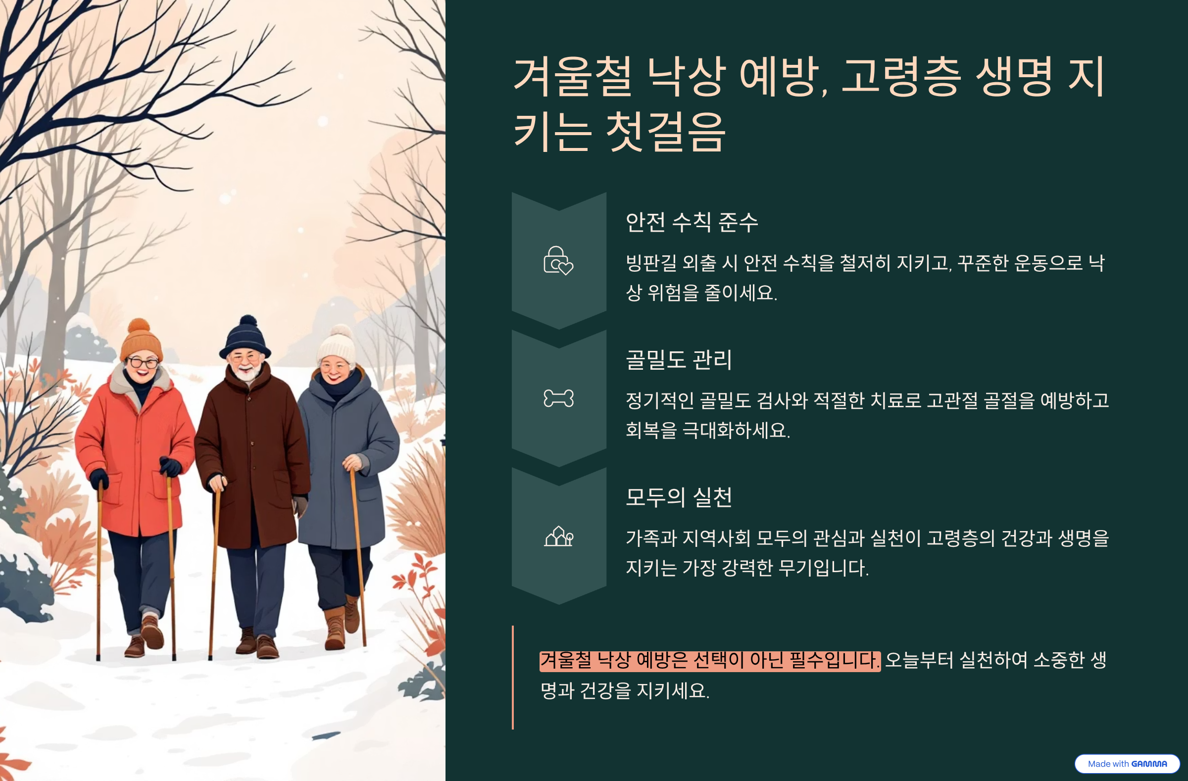 | 외출 시 | 보폭을 평소보다 20% 줄이기, 장갑을 착용해 손을 주머니에서 빼기 | 무게 중심 확보 |