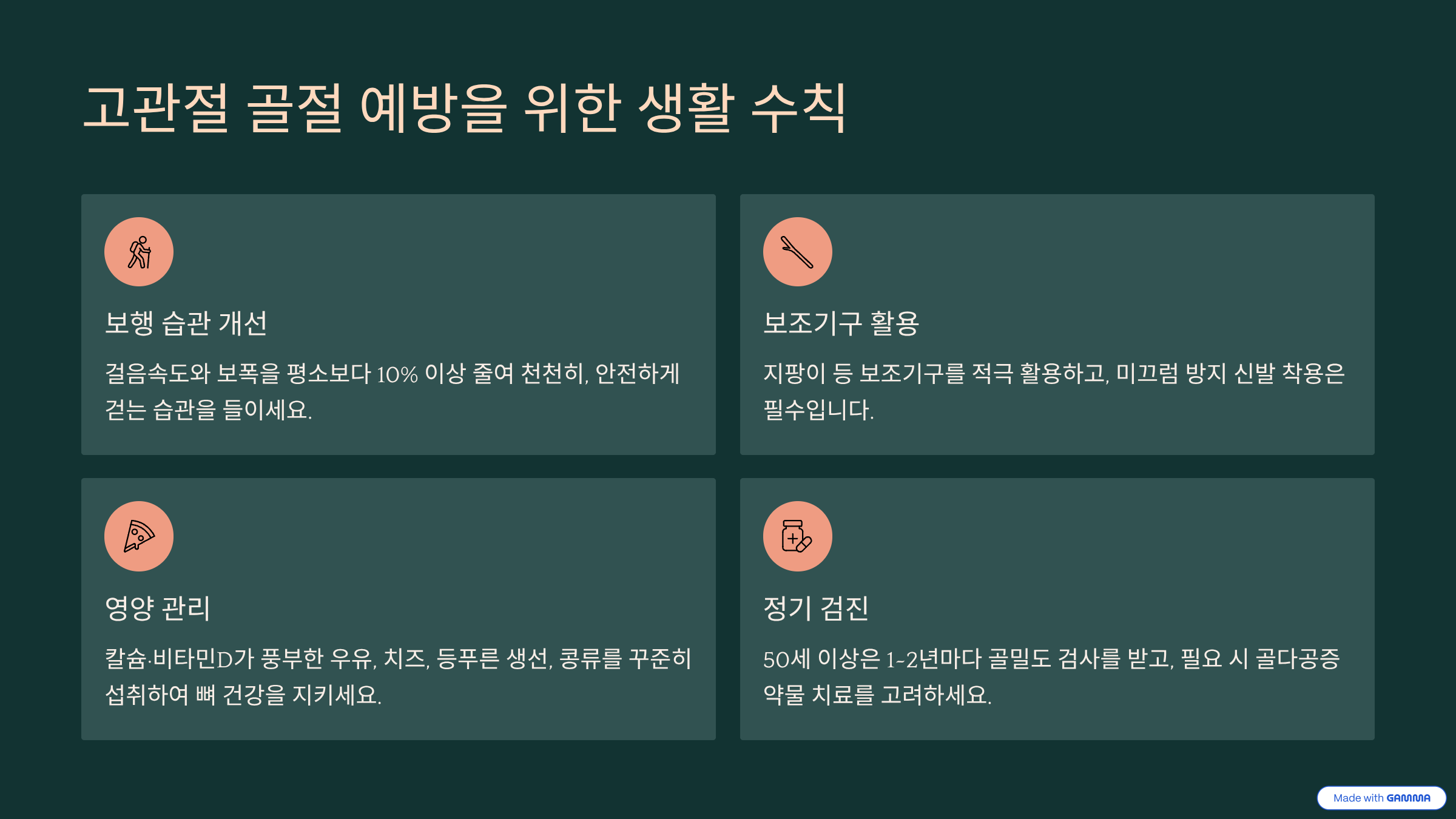 | 건강 관리 | 꾸준한 칼슘/비타민D 섭취, 하지 근력 강화를 위한 스쿼트 및 걷기 | 골다공증 예방 |