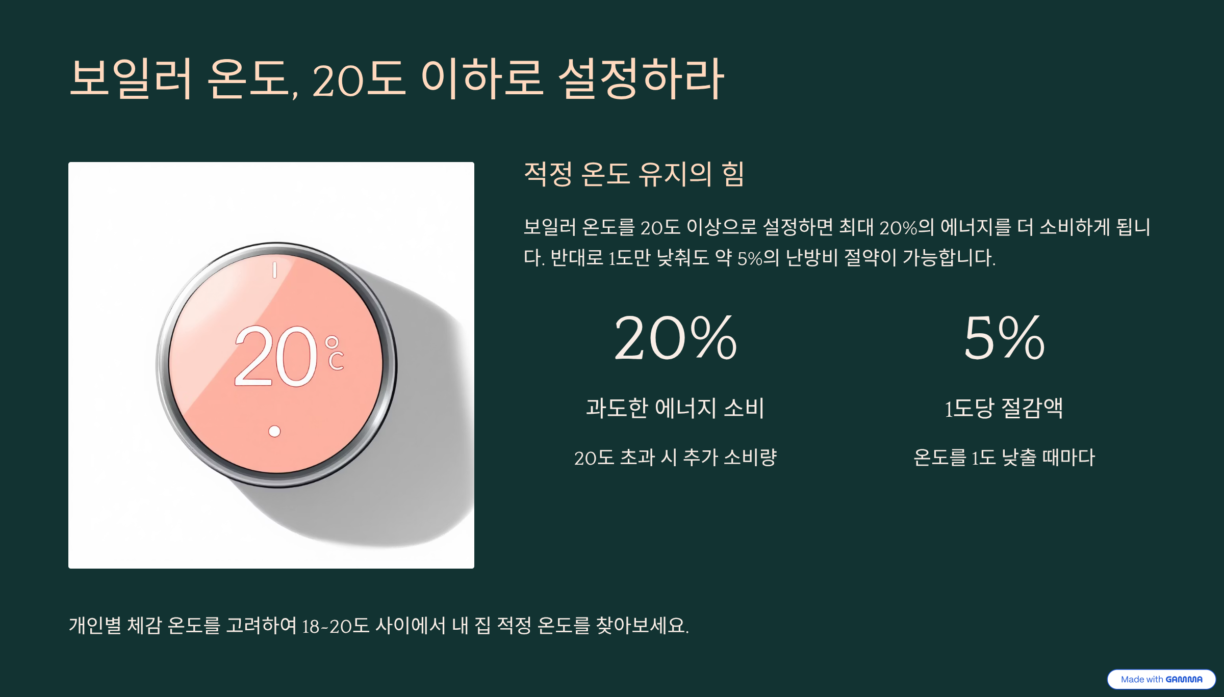 한국에너지공단에 따르면, 겨울철 실내 적정 온도는 20℃입니다. 다소 낮게 느껴질 수 있지만, 이를 실천하면 놀라운 절감 효과가 나타납니다.
