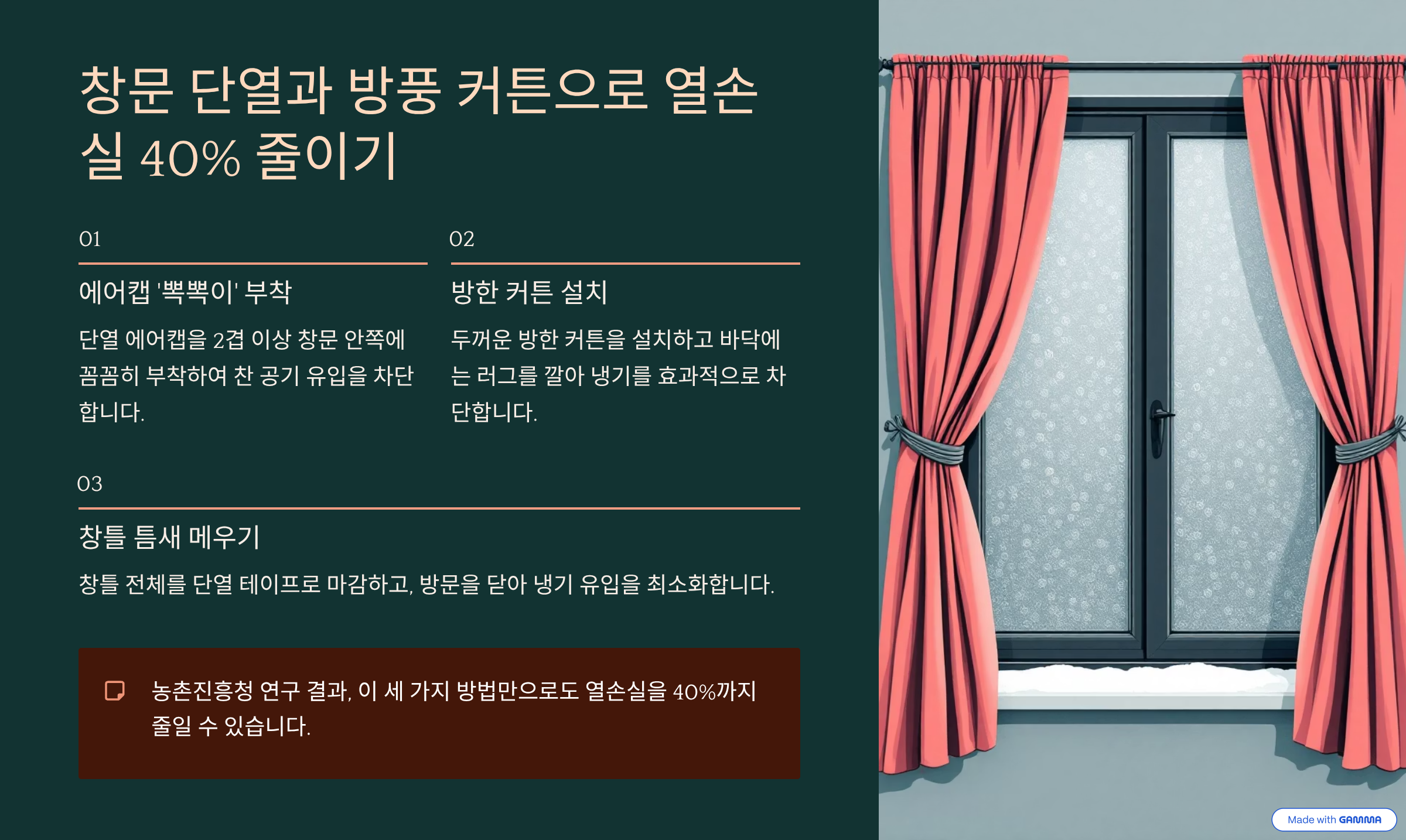 - 에어캡(뽁뽁이)과 문풍지: 창문과 문틈의 열 손실을 막으면 실내 온도가 2~3℃ 상승합니다.