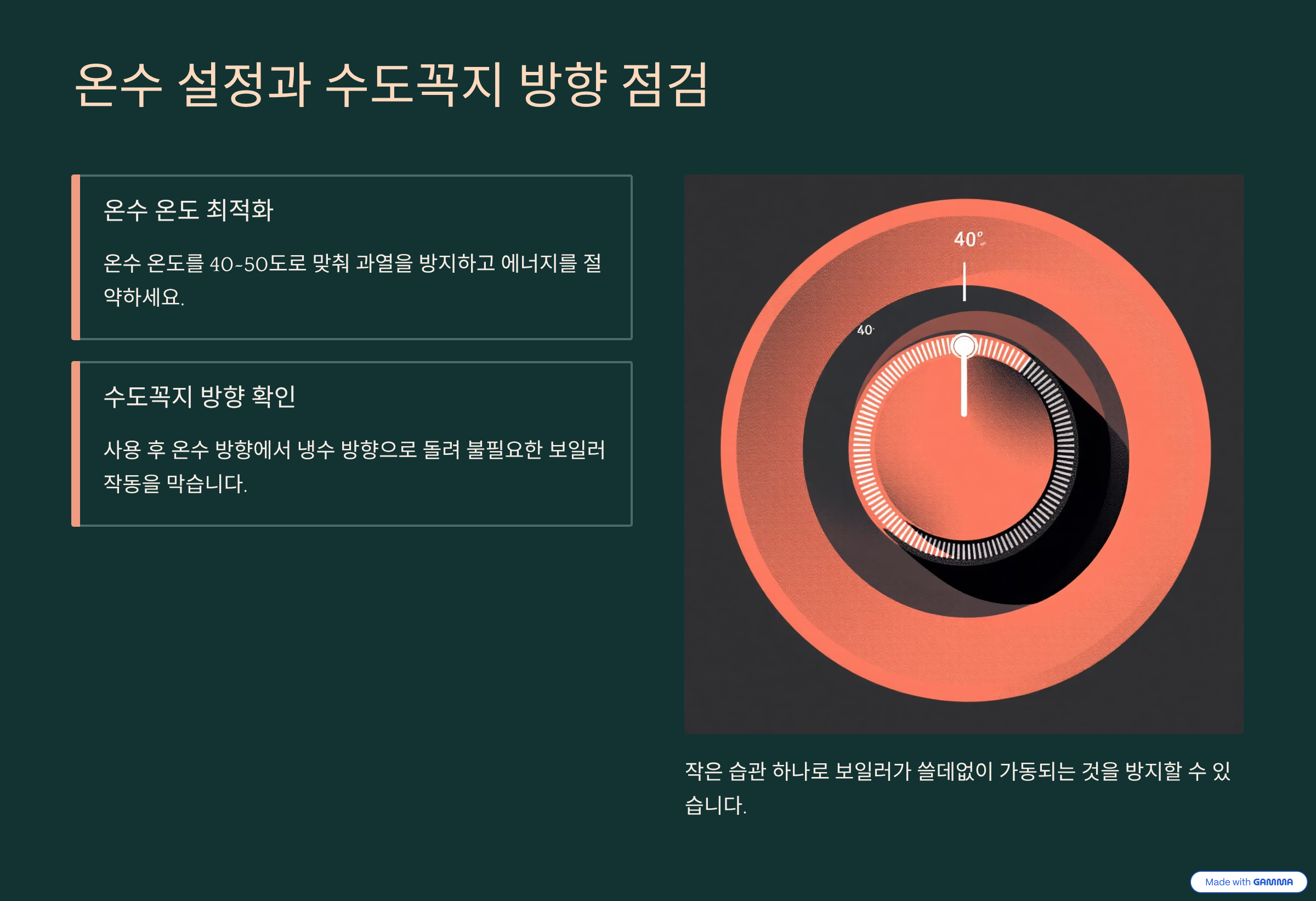 - 지역난방 사용자: 지역난방은 '연속 난방' 시스템이므로 24시간 일정 온도를 유지하는 것이 가장 저렴합니다. 껐다가 켜면 엄청난 급탕비가 발생할 수 있습니다.