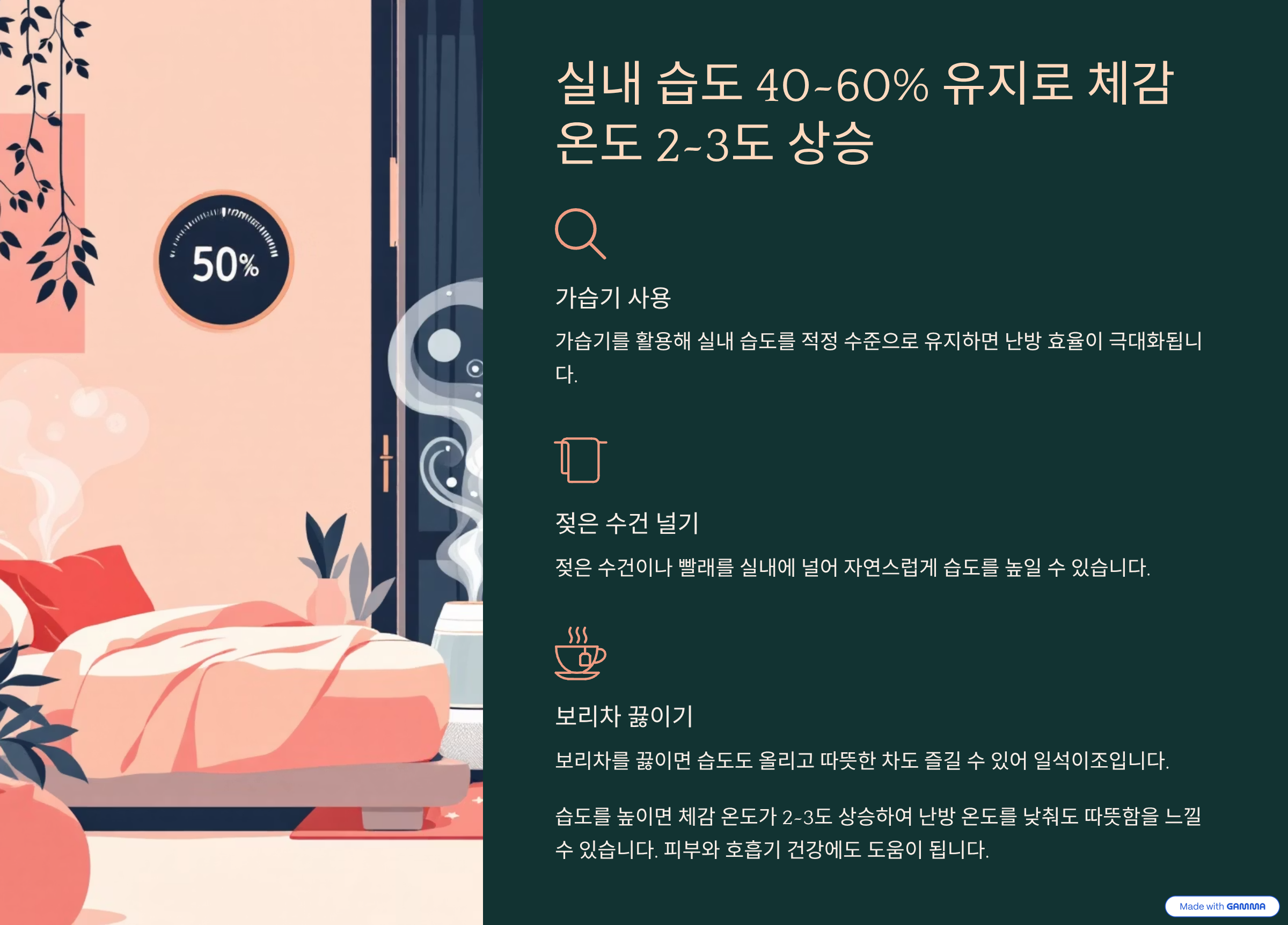 - 가습기 사용: 보일러 가동 시 가습기를 틀면 습도가 높아져 공기 순환이 빨라지고, 열을 오래 머금어 실내 온도가 더 빨리 올라갑니다.