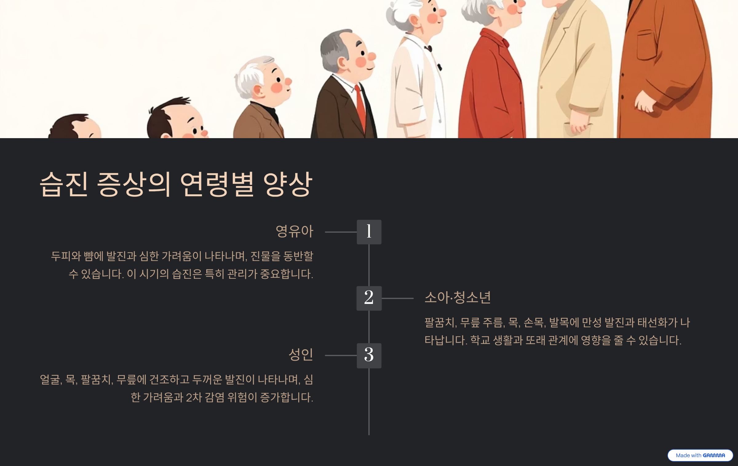 상체나 피부 표면으로는 열이 몰리고, 하체나 내부 장기는 차가워지는 '상열하한(上熱下寒)'의 상태는 면역력을 급격히 떨어뜨린다. 피부로 몰린 열은 수분을 증발시켜 건조함을 유발하고, 이는 곧 가려움증과 각질로 이어진다. 가려워서 긁게 되면 상처가 생기고, 그 틈으로 세균이 침투해 진물이 나는 악순환이 반복된다.